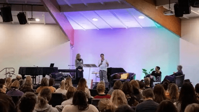 A large crowd packed the auditorium at the Life Church to take part in the first Trauma-informed Care National Training Day. From left, Dr Bronwyn Dunnachie, Werry Workforce Whāraurau; Anah Aikman, South Canterbury DHB; Dr Moana Eruera, Oranga Tamariki and Assoc. Prof Nicola Atwool, Otago University.
