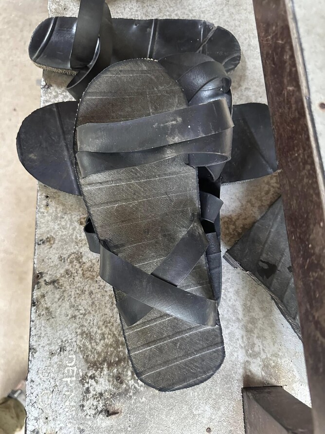Rubber Trees are a prominent feature of the landscape towards the Ch Chi Tunnels, imported to Vietnam by French Colonists. These rubber sandals felt hard and uncomfortable to the touch. Worn backwards by the Resistance fighters living in the tunnels, these sandals were a strategic tactic to confuse enemy soldiers in tracking the directional movement of the Vietnamese, the people of the land.